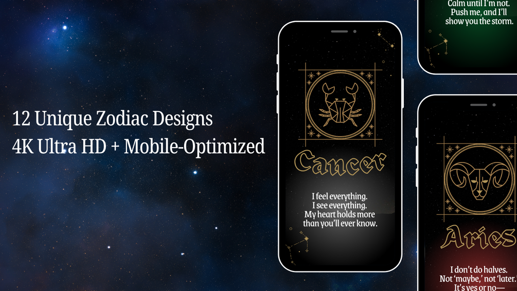 12 Zodiac Wallpapers (Aries to Pisces) – 4K Ultra HD for desktop + mobile-optimized versions.